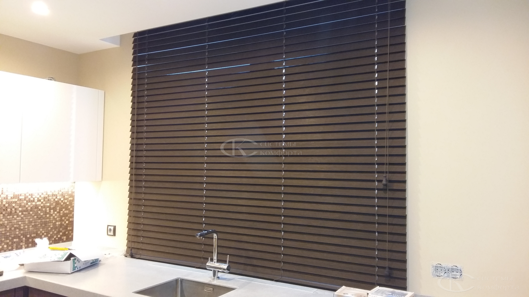 - Кухня: практичность и влагоустойчивость, устойчивость к жиру. Горизонтальные алюминиевые, деревянные или простые в чистке рулонные шторы из синтетической ткани.