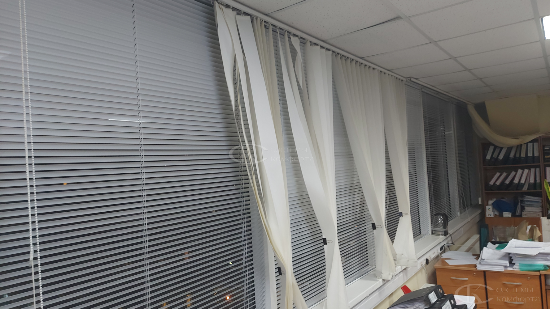 Для управления системой предусмотрены пластиковый прут и тросик. Прутом регулируется угол наклона планок, а тросиком производится подъем и опускание ламелей.